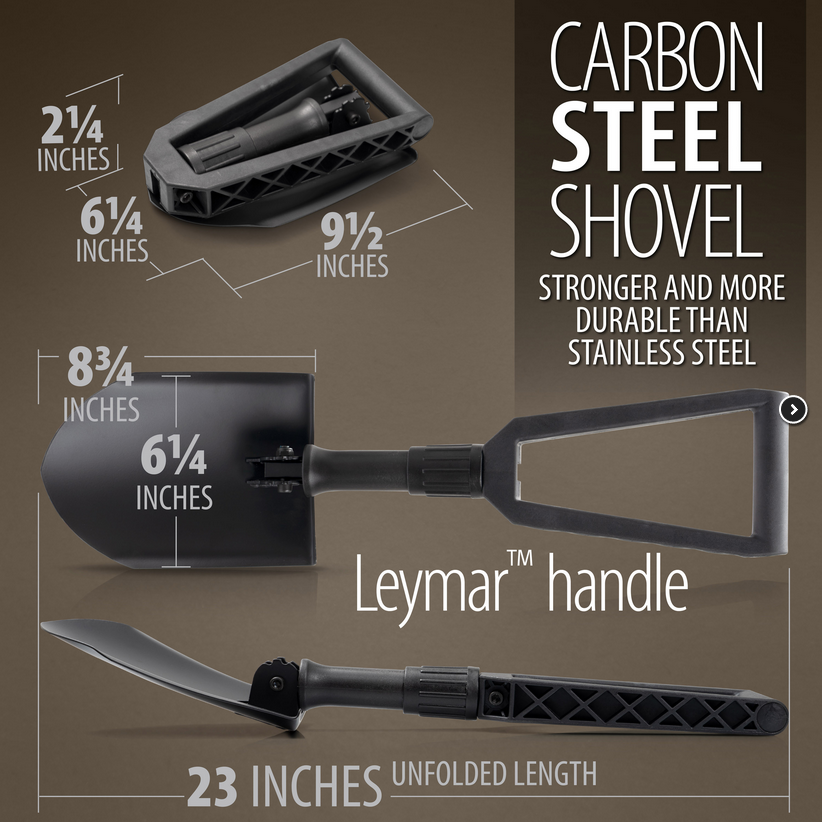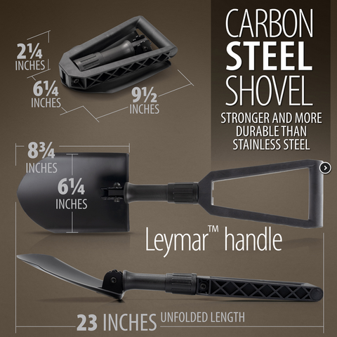 • The Maxam foldable survival shovel is made of High-Carbon Steel with Leymar handle which is wear resistant and durable enough to withstand entrenching, digging, shoveling