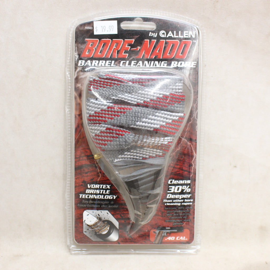 Allen’s revolutionary BORE-NADO™ barrel cleaning rope makes taking care of your firearm easy.  Simply add solvent of your choice to the cleaning rope and clean from breach to muzzle in a single stroke, repeating as necessary until clean.  The small end of the rope has a weighted brass bore guide to make guiding the rope through your firearm easy.  The vortex bristle technology uses copper brushes to blast fouling and debris as it passes through your barrel, and the built-in braided swab sweeps it away.  Keep in your range bag or gun case for quick clean-up jobs.  Can also be incorporated into your full cleaning routine if you aren’t a fan of handing all the interchangeable parts of other cleaning systems.